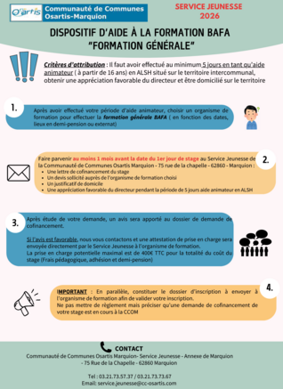 Vous souhaitez animer des accueils de loisirs, vous pouvez bénéficier d’une aide. Il s’agit d’une aide technique et financière qui permet aux jeunes, domiciliés sur le territoire de la Communauté de Communes Osartis-Marquion, d’accéder à la qualification et de valoriser leurs compétences en animation selon critères. Téléchargez le dossier ci-dessous.