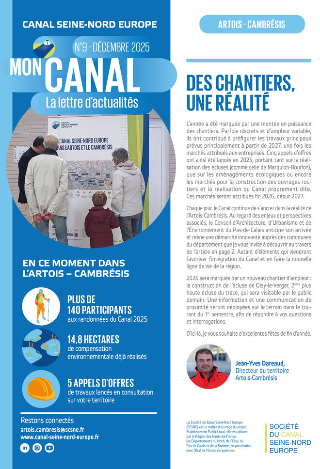 En traversant les grands plateaux artésiens, le Canal Seine-Nord Europe imprimera sa marque dans le paysage. Par son implantation et ses dimensions, il s’imposera comme l’un de ses repères. Il sera alors une composante paysagère et identitaire du territoire. Au cœur de ce territoire agricole, le Canal Seine-Nord Europe bordera le futur port intérieur de Marquion-Cambrai et le quai de transbordement de Graincourt-lès-Havrincourt, renforçant la vocation logistique du secteur et son attractivité économique, génératrice d’emplois durables, notamment pour l’agro-industrie. On ne peut évoquer le Canal Seine-Nord Europe sans parler du canal du Nord. Ouvert à la navigation en 1965 avec un gabarit limité par une conception de la fin du XIXème siècle, il est à ce jour le principal lien fluvial entre le bassin de la Seine et le nord de la France. Il sera utile au projet, en particulier pour approvisionner le chantier, avant d’être partiellement comblé par les excédents de matériaux issus des terrassements du CSNE.