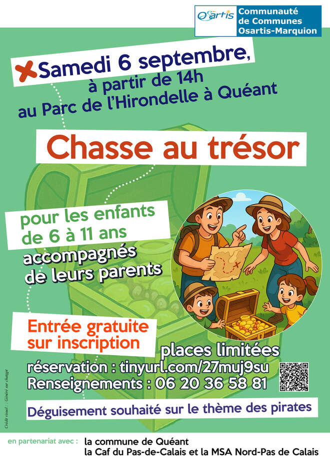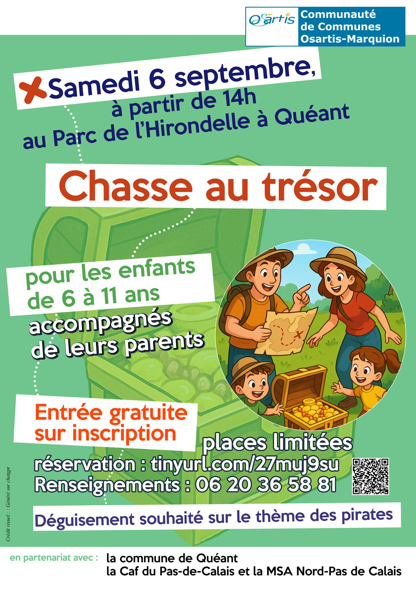 Dans un souci d’organisation et les places étant limitées, il est demandé aux familles intéressées de s’inscrire précédemment sur le lien disponible sur le site internet de la Communauté de Communes Osartis-Marquion à l’adresse suivante : https://www.cc-osartis.com/agenda/231/6-action-chasse-au-tresor.htm