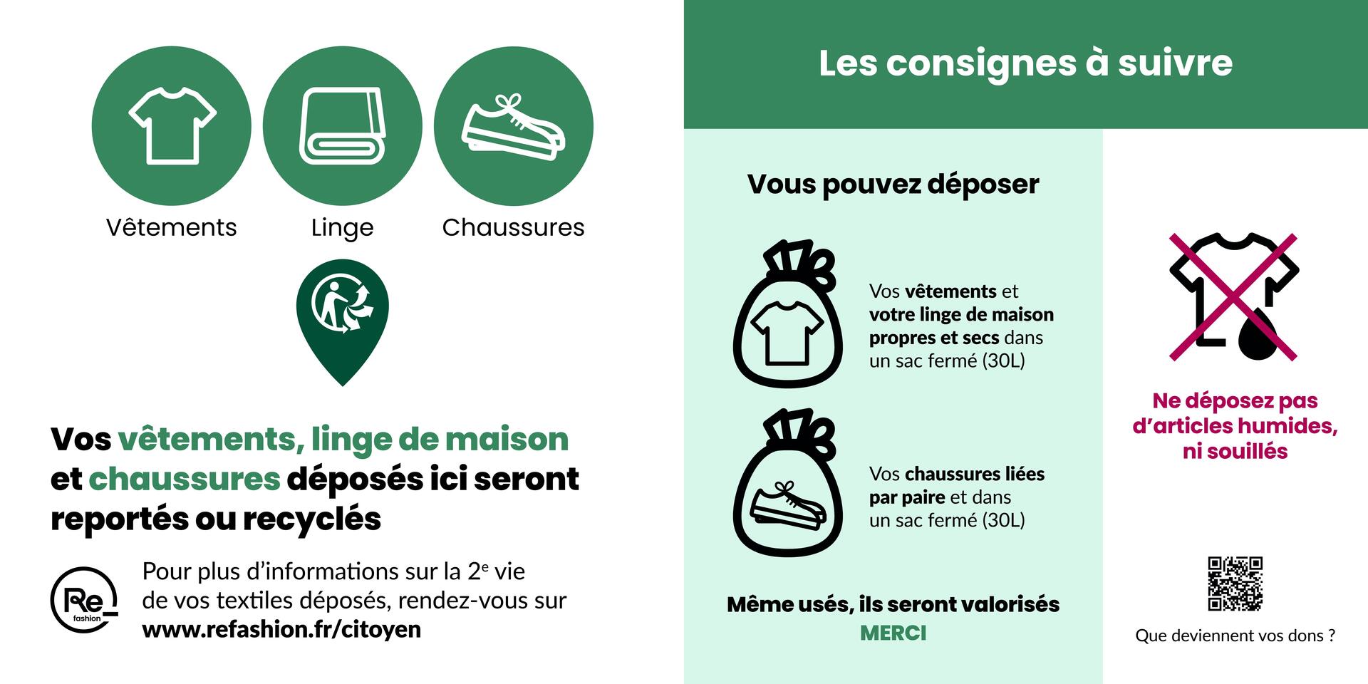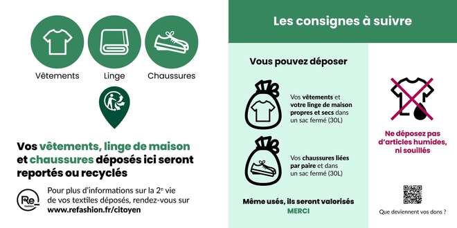 - Modalités de dépôts : L’ensemble des textiles doit être propre et sec, les chaussures s’attachent par paire, le tout placé dans un sac fermé.