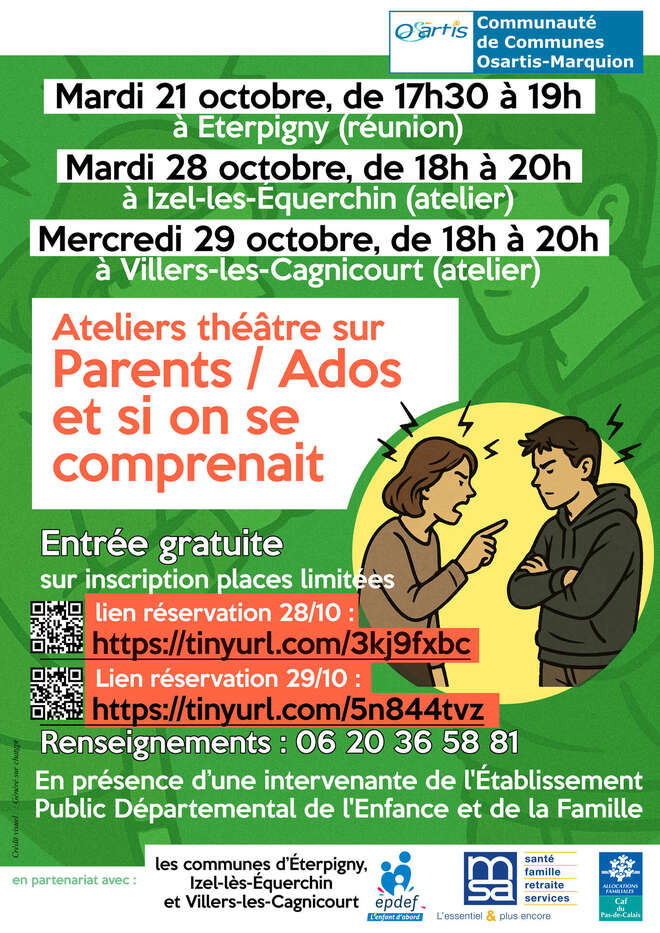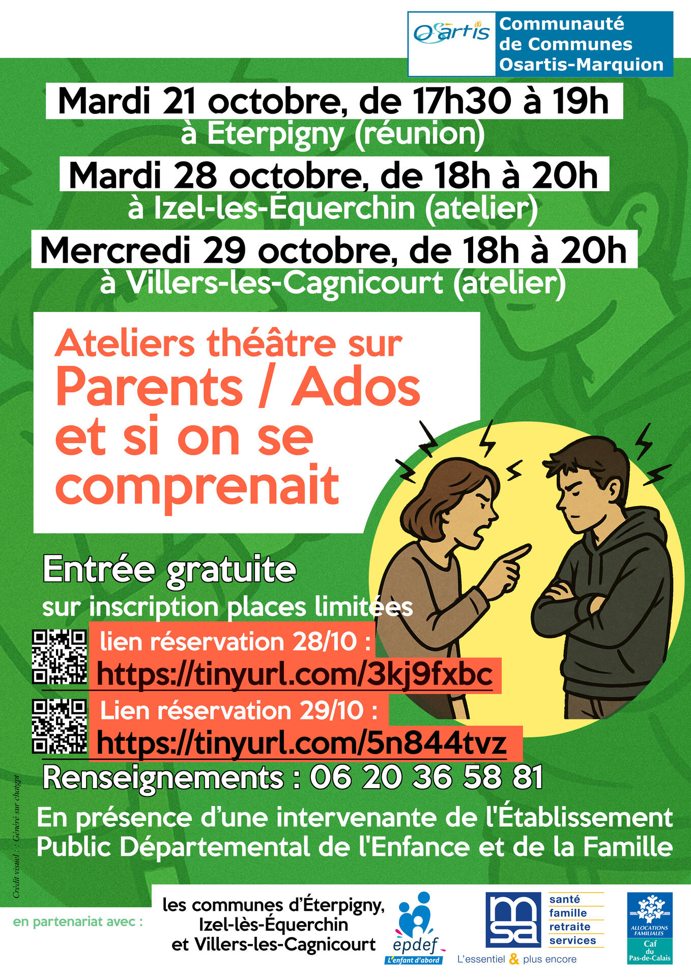 Réunion préparatoire (obligatoire) le 21 octobre de 17h30 à 19h à Éterpigny Ateliers théâtre Parents-Ados : - Le 28 octobre de 18h à 20h à Izel-les-Équerchin - Le 29 octobre de 18h à 20h à Villers-lez-Cagnicourt