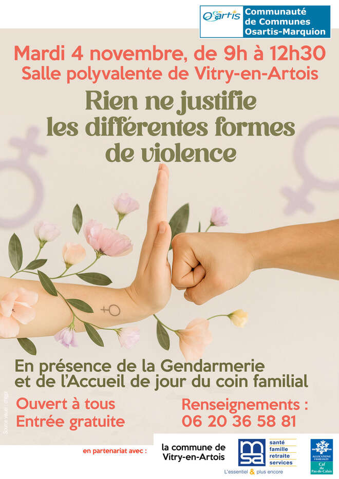 Le mardi 4 novembre, à partir de 9h00, la Communauté de Communes Osartis-Marquion vous convie à une action de sensibilisation sur les différentes formes de violence à la salle Polyvalente de Vitry-en-Artois