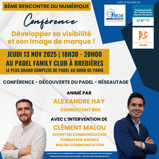 La BGE et la Communauté de Communes Osartis-Marquion vous invitent à la soirée numérique le jeudi 13 novembre 2025 à partir de 18h30 au PADEL FAMILY CLUB situé au 1 Rue Jean Monnet, ZI Horizon 2000 à Brebières (62117).