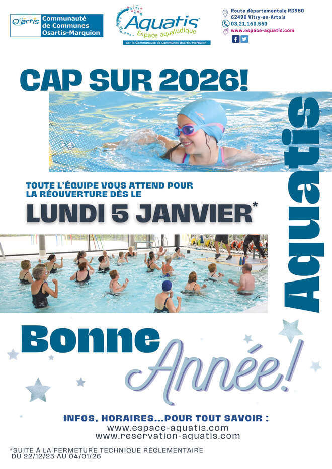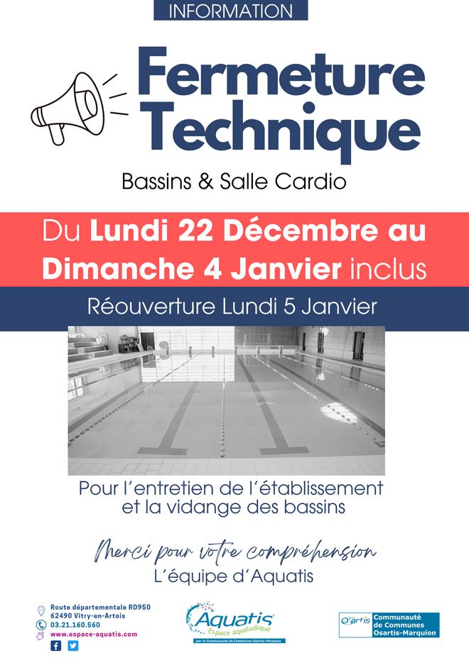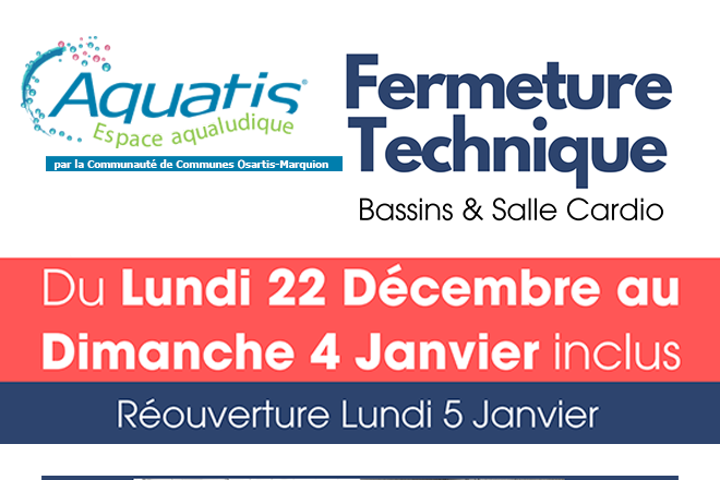 L’espace aqualudique communautaire Aquatis sera fermé du lundi 22 décembre 2025 au dimanche 4 janvier 2026 inclus, afin de procéder à l’entretien de l’établissement et à la vidange règlementaire des bassins.