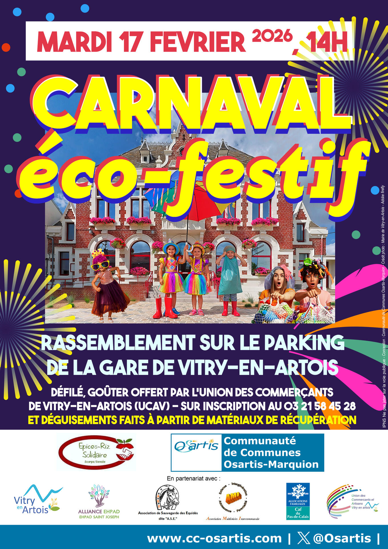 Le 17 février, la Communauté de Communes Osartis-Marquion, l’Épices-riz solidaire et la commune de Vitry-en-Artois organisent un carnaval basé sur le recyclage. Rendez-vous pour le départ à 14h sur le parking de la gare de Vitry-en-Artois.