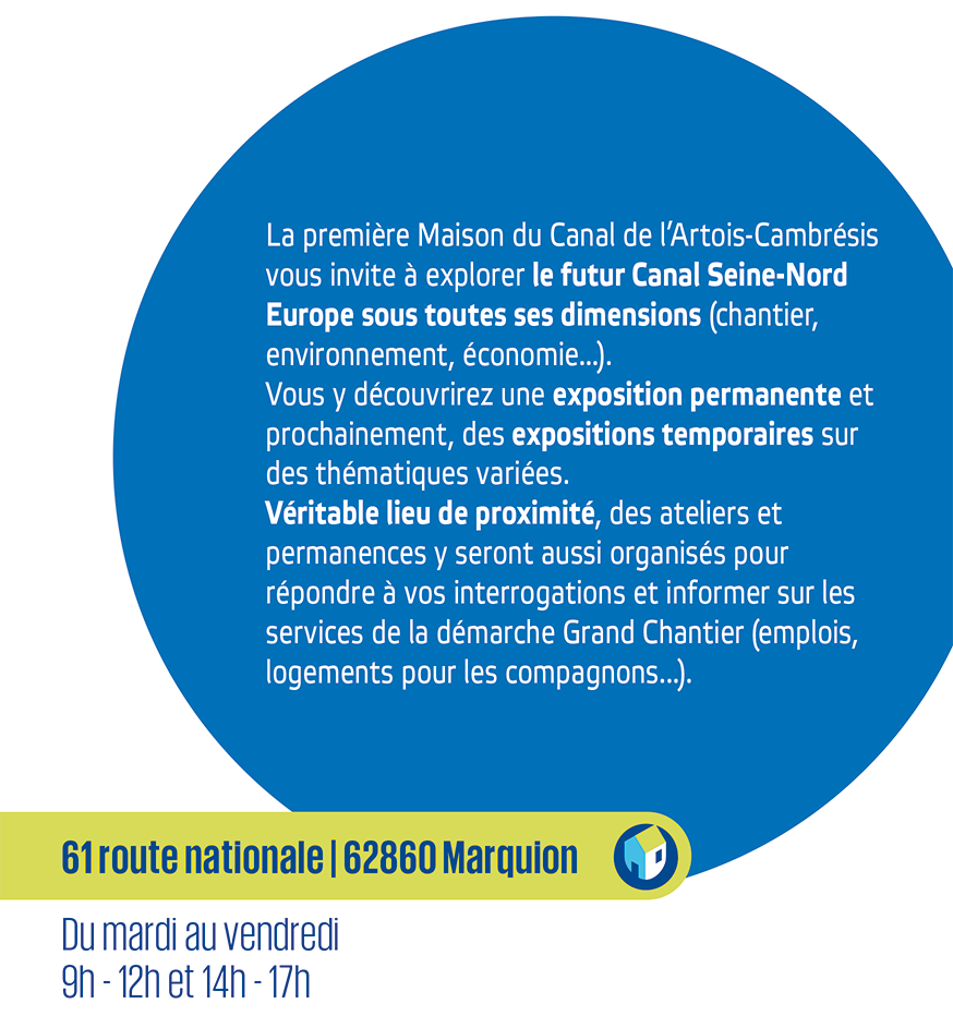 Si avoir une « base arrière » était une évidence pour accompagner le chantier, son utilisation étant limitée à la durée des travaux du Canal, le choix économique de réutiliser un bâtiment vacant est apparu comme une évidence. C’est ainsi que le bâtiment abritant auparavant le Trésor public de Marquion a été choisi. Après location, adaptation et rénovation (par l’association EVE d’Écourt-Saint-Quentin), les éléments pédagogiques de la Société du Canal Seine-Nord Europe ont été installés pour donner vie au lieu et apporter une information pédagogique sur le canal.