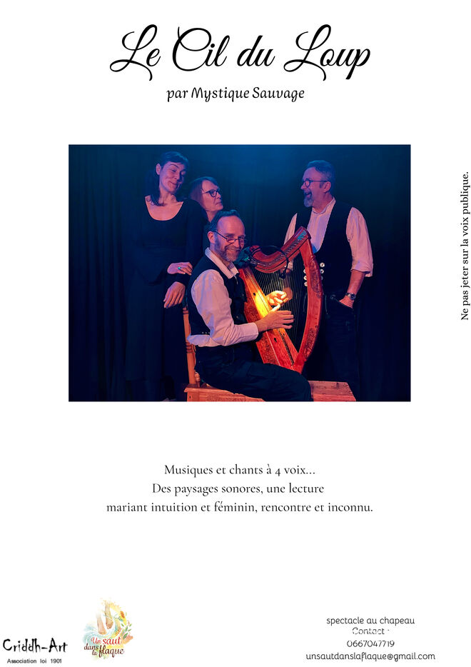 Entre traditions et modernité, quatre comédiens, musiciens et chanteurs vous embarquent pour 50 minutes dans une atmosphère musicale traversant les époques du Moyen-Âge à nos jours et les continents, tous reliés par un conte : "Le Cil du Loup".