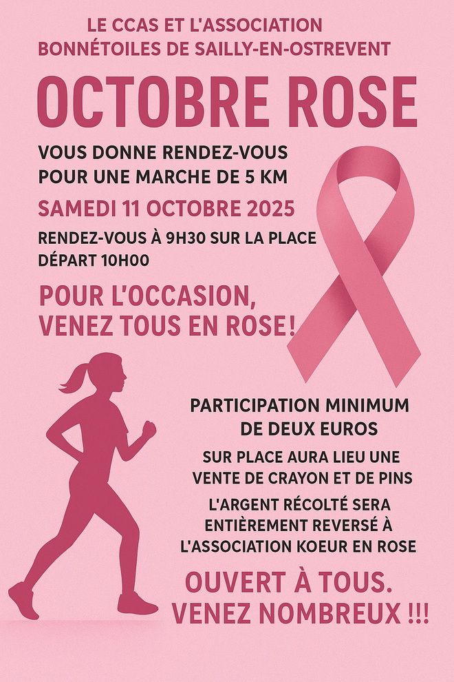 Samedi 11 octobre. Marche Octobre Rose. Organisée par le CCAS et l'Association Bonnétoiles de Sailly-en-Ostrevent.