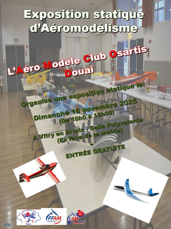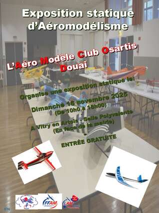 L'Aéro Modèle Club Osartis Douai (AMCOD) organise une exposition statique d'aéromodélisme le dimanche 16 novembre 2025. Elle se déroulera dans la salle des fêtes (Salle Polyvalente) de Vitry en Artois (En face de la mairie).