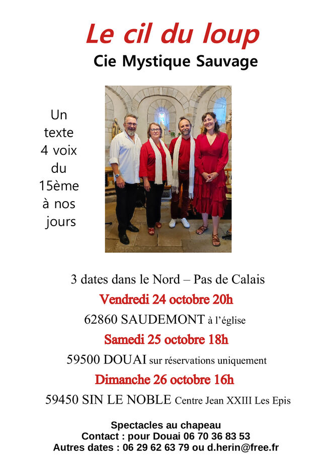 Entre traditions et modernité, quatre comédiens, musiciens et chanteurs vous embarquent pour 50 minutes dans une atmosphère musicale traversant les époques du Moyen-Âge à nos jours et les continents, tous reliés par un conte : "Le Cil du Loup".