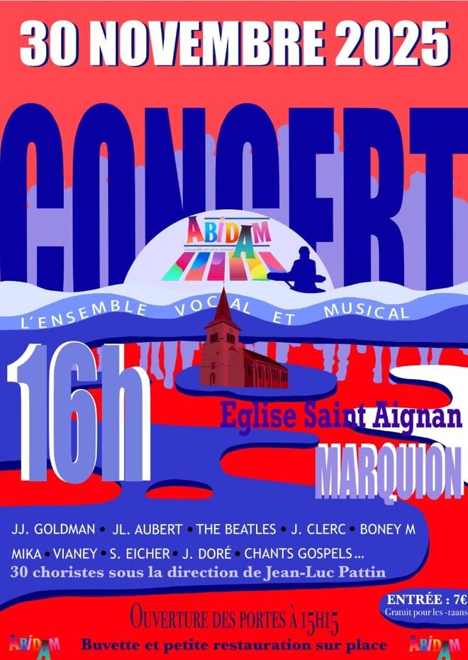 Dimanche 30 novembre. Concert de l'ensemble vocal et musical ABIDAM. En l'Église Saint-Aignan de Marquion. Entrée 7€, gratuit pour les moins de 12 ans. Ouverture des portes à 15h15. Buvette et restauration sur place.