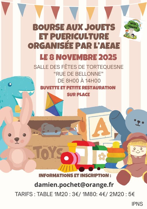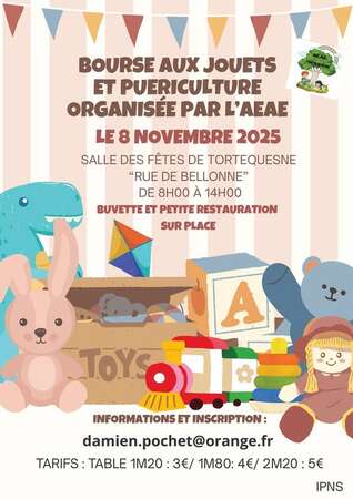 Samedi 8 novembre. Bourse aux jouets et puericulture. De 8h à 14h, organisée par l'AEAE. Informations et inscription : damien.pochet@orange.frBuvette et restauration sur place.
