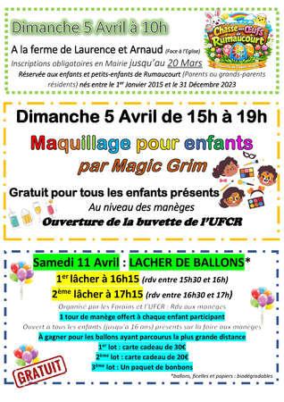 Samedi 11 Avril à 16h (rdv 15h30) et 17h (rdv 16h30) aux manèges : LÂCHER DE BALLONS. (gratuit et ouvert à tous). Les forains offriront 1 tour gratuit à chaque enfant participant (jusqu’à 16 ans). 3 lots à gagner pour les ballons qui auront parcouru la plus grande distance.